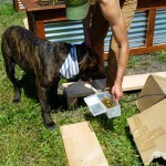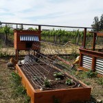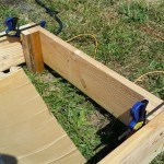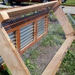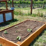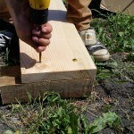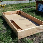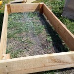 Once all wood has been cut down to size, it’s just a matter of screwing things together. The 4×4’s will function as the corner posts, and depending on your preference, can be fixed to the inside or outside of the bed. We chose to position them inside. Each board received two lag screws to attach it to the corner post. These corner posts should be flush with the top of the 2×10, and will extend a bit to form a short leg. We dug shallow holes in the ground for the excess to sit, acting as a bit of an anchor to keep the raised bed from shifting while being filled, or if bumped by the mower. Once all sides are attached, we stapled two layers of gopher wire to the bottom, and then painted the wood with a 7-year protectant and stain. To keep weeds from growing up though the bed, we put down a layer of cardboard in each. Last: fill with dirt, seedlings, and top with a trellis. Check out our post on building cheap and easy hog panel trellises.