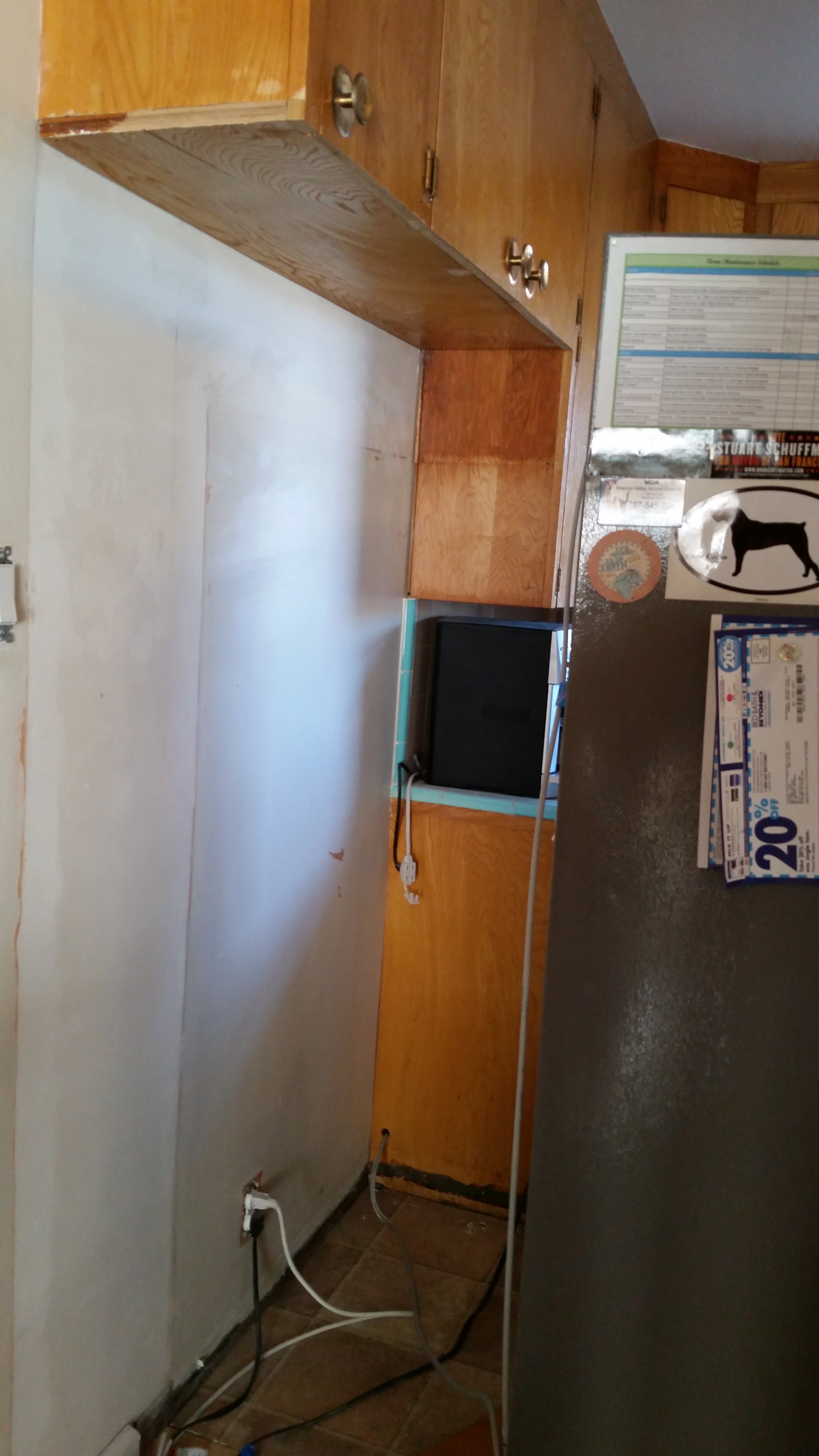 Last June 13 (2015), we pulled the trigger on prepping the kitchen for a new refrigerator. When the house was built in 1956, I’m sure the tiny refrigerator was sufficient. We found out from one of the ladies who grew up here that it was turquoise like the tiles, stove and oven so I’m positive it was state of the art and super trendy for the time.