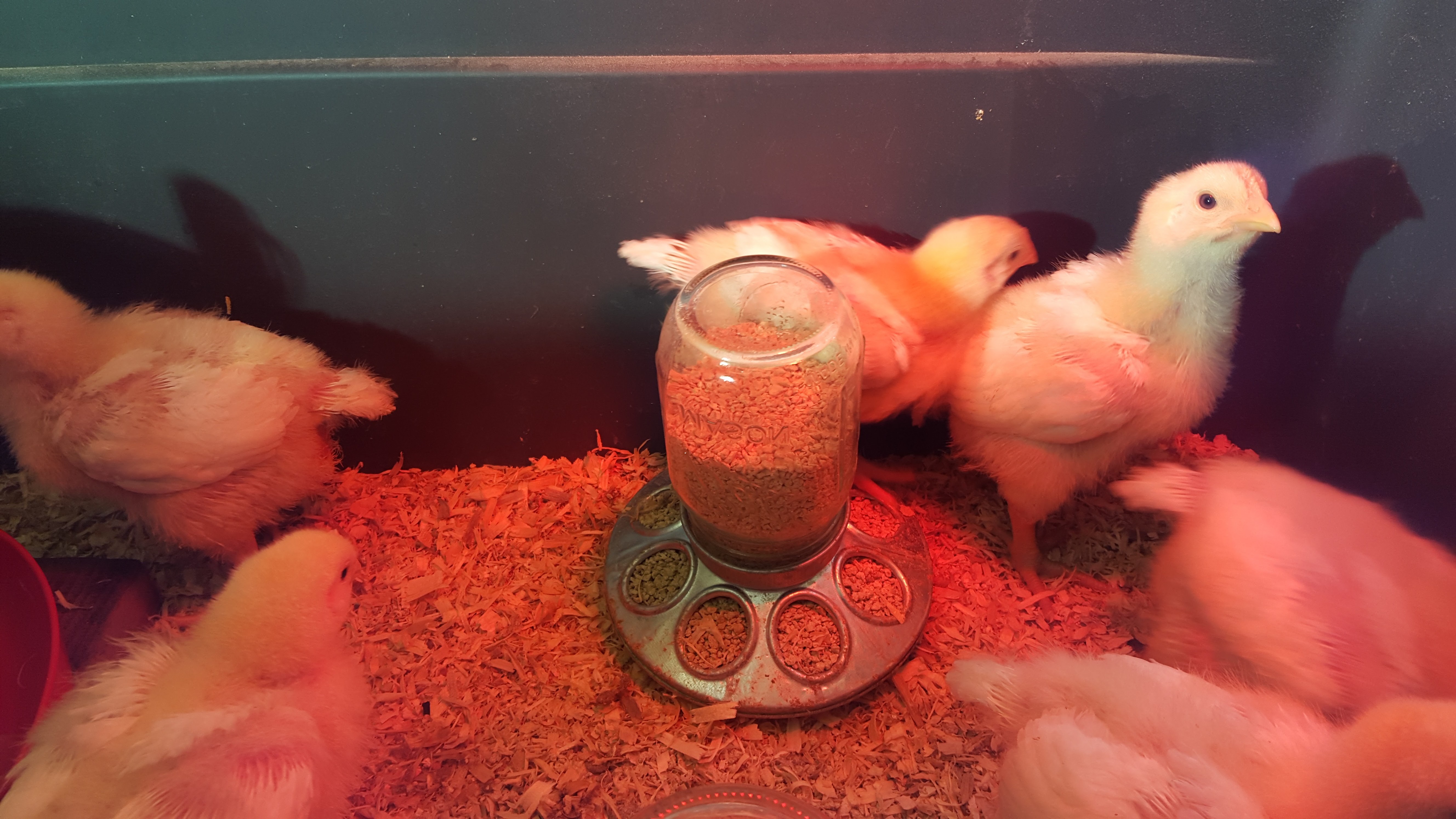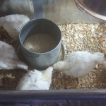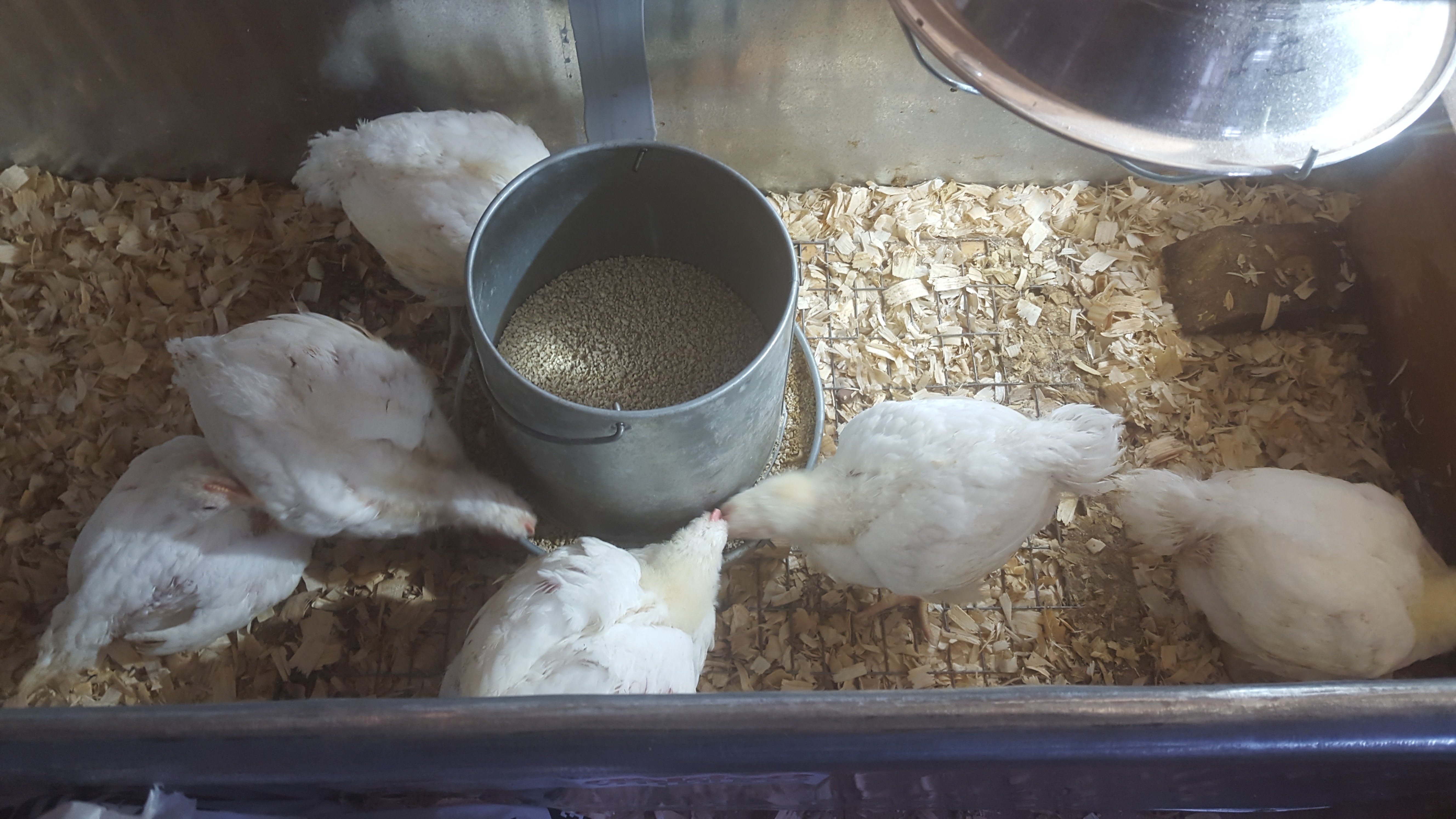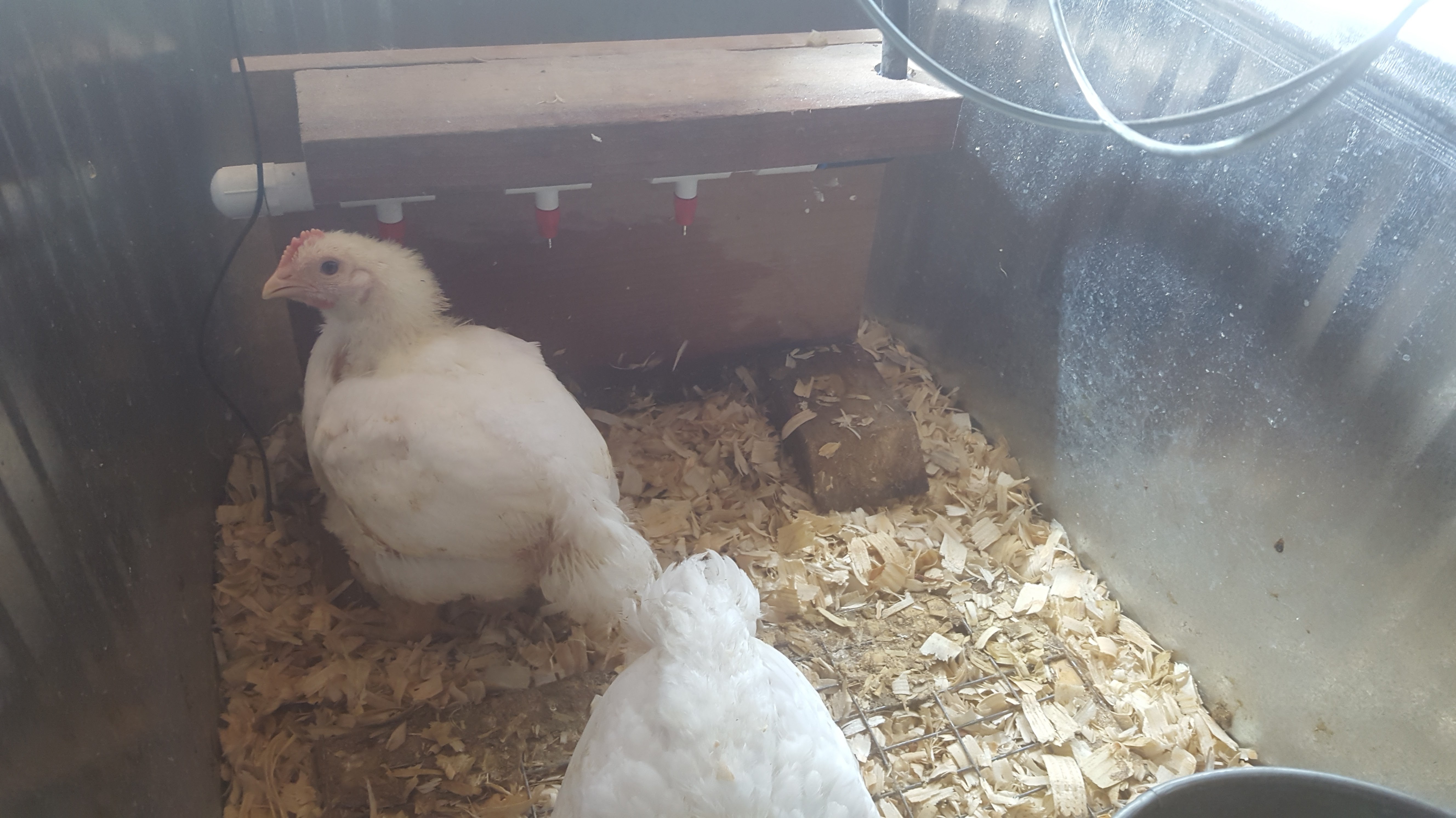 As day old chicks, there was no visible difference between the Cornish X and any other fluffy little chickee. They would peep and chase each other from the food dish to the water and back. Normal active chicks. The first thing I noticed though, was their appetite. They eat and drink like they’ve never been fed before. All this food consumption started turning into growth quickly. I checked on the chicks to refill food and water twice a day, and I swear they were visibly larger each time I saw them. Tremendous food consumption also means tremendous waste production, and these chicks also got new litter every single day to keep them on dry, clean bedding. As they grew, their activity waned. After a week or so, being fed a non-medicated 20% protein chick starter/grower diet, they had easily doubled in size and most running/chasing behavior had ceased. They plop themselves down in front of the food and gorge until they’re full, maybe taking a few steps to get a drink of water before laying down again.