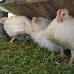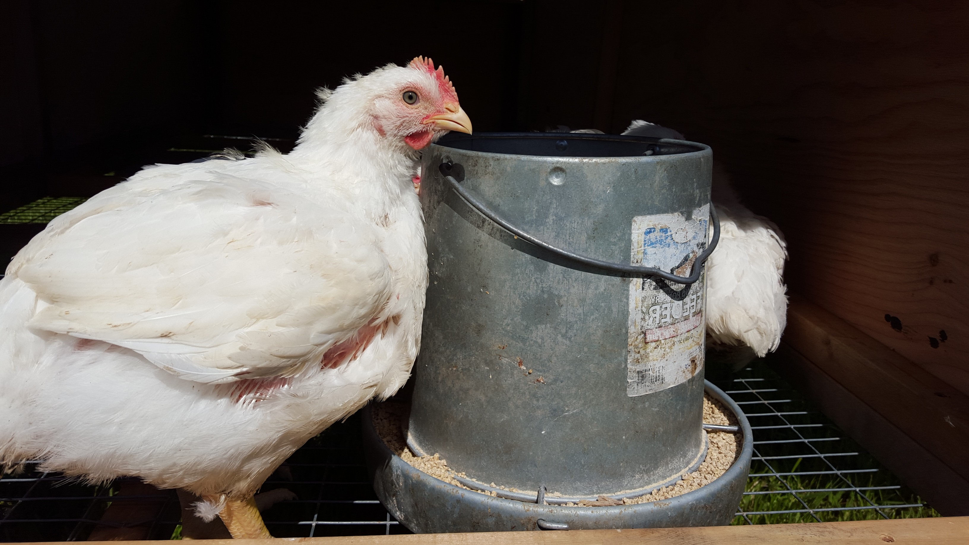 After some bad weather in week 3, the meat balls were moved out to pasture on week 4. Sunlight, fresh air, bugs and grass – none of it seemed to matter to these guys. In fact, they voluntarily left the chicken tractor 0 times to forage or move about on their own. The up-side for me was that I could move the tractor, and no longer needed to add a daily layer of clean bedding, but I’m not sure the birds got much benefit from their short time outside.